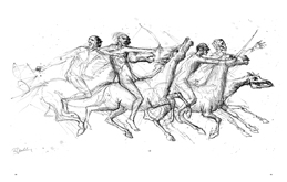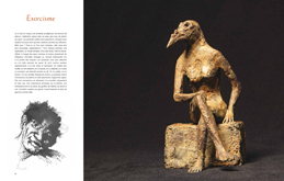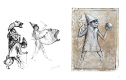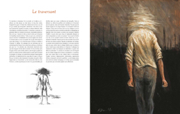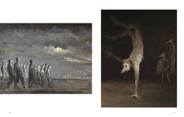 Dans ce monde sans paysage où des cortèges célèbrent je ne sait quoi, nous sommes à la fois spectateurs et participants cachés derrière un masque à la tête de mort joyeuse voisinant avec un homme-poisson énigmatique. Dans ce noir, blanc, gris, j’adore ces silhouettes qui avancent sur un sable sans bord de mer au son d’une grosse-caisse battante, des flûtes joyeuses, d’accordéons rieurs parmi des chèvres et des ânes à tête de squelette , silhouettes qui sont comme autant de notes de musique dansant sur une portée invisible.