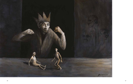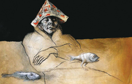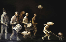 Ce sont les mêmes qu’à l’extérieur : des hommes poissons ou des squelettes musiciens autour desquels tu ajoutes parfois des évêques ou des bourgeois éteints. Il est difficile de rouvrir les yeux après avoir vu tes toiles ou tes superbes dessins qui reflètent le plus profond de nous avant même d’être ici quand nous appartenions encore au monde de l’eau d’où viennent tes poissons qui évoluent dans tes tableaux mais qui n’ont pas besoin de la mer pour se mouvoir, comme tes personnages n’ont pas besoin de rue et de champs pour marcher. Ta plume dont on entend le crissement sur le papier au milieu de la fanfare de tes hommes perdus, éclopés et mutants qui sont nos frères dans notre monde qui perd chaque jours son sens, ta plume nous griffe dans notre errance avec ton regard de roi débonnaire et rieur qui fait un clin d’œil à notre solitude.