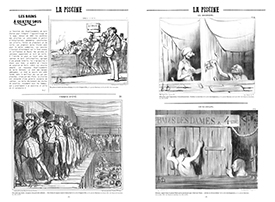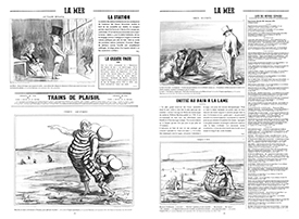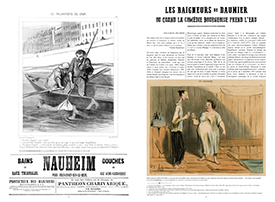 Daumier est l’un des illustrateurs les plus mordants du célèbre journal satirique Le Charivari, ses compositions audacieuses et son écriture abrégé font de lui un artiste moderne. Il porte un regard aiguisé sur les aventures et mésaventures des baigneurs et témoigne d’une époque lointaine (les années 1840-1850), où les citadins commencent tout juste à envisager l’intérêt hygiénique d’une pratique « sportive ».